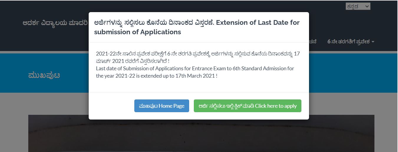 ಆದರ್ಶ ವಿದ್ಯಾಲಯ 2020-21 ನೇ ಸಾಲಿನ 6ನೇ ತರಗತಿಗೆ ಪ್ರವೇಶಕ್ಕಾಗಿ ಪ್ರವೇಶ ಪರೀಕ್ಷೆಗೆ ಆನ್ಲೈನ್ ಮೂಲಕ ಅರ್ಜಿ ಆಹ್ವಾನಿಸಲಾಗಿದ್ದು, ಅರ್ಜಿ ಸಲ್ಲಿಸುವ ಕೊನೆಯ ದಿನಾಂಕವನ್ನು ಮಾರ್ಚ್ 17,2021ರ ವರೆಗೆ ವಿಸ್ತರಿಸಲಾಗಿದೆ.