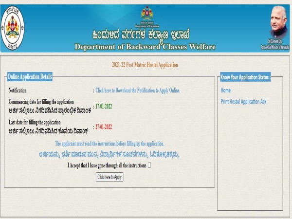 2021-22ನೇ ಸಾಲಿಗೆ ಹಿಂದುಳಿದ ವರ್ಗಗಳ ಕಲ್ಯಾಣ ಇಲಾಖೆಯ ಮೆಟ್ರಿಕ್ ನಂತರದ ವಿದ್ಯಾರ್ಥಿ ನಿಲಯಗಳ ಪ್ರವೇಶಕ್ಕೆ ಆನ್ಲೈನ್ ಮೂಲಕ ಅರ್ಜಿ ಆಹ್ವಾನಿಸಲಾಗಿದೆ.