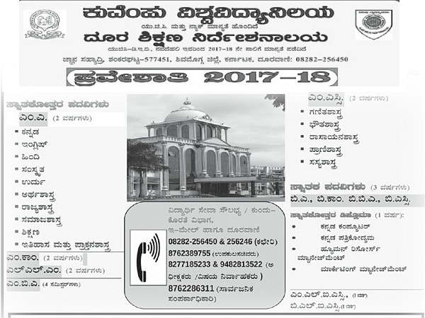 ಕುವೆಂಪು ವಿಶ್ವವಿದ್ಯಾನಿಲಯ ದೂರ ಶಿಕ್ಷಣ ನಿರ್ದೇಶನಾಲಯದ 2017-18ನೇ ಸಾಲಿನ ಸ್ನಾತಕ/ಸ್ನಾತಕೋತ್ತರ/ಪಿಜಿ ಡಿಪ್ಲೊಮಾ ಪದವಿಗಳ ಪ್ರವೇಶಕ್ಕಾಗಿ ನಿಗದಿತ ನಮೂನೆಯಲ್ಲಿ ಆನ್-ಲೈನ್ ಮೂಲಕ ಅರ್ಜಿಗಳನ್ನು ಆಹ್ವಾನಿಸಲಾಗಿದೆ.