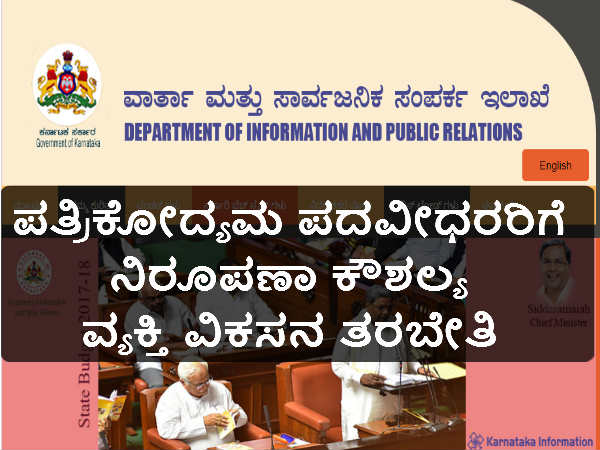 ವಾರ್ತಾ ಮತ್ತು ಸಾರ್ವಜನಿಕ ಸಂಪರ್ಕ ಇಲಾಖೆ 2017-18 ಸಾಲಿನ ನಿರೂಪಣಾ ಕೌಶಲ್ಯ ವ್ಯಕ್ತಿ ವಿಕಸನ ತರಬೇತಿಗಾಗಿ ಪರಿಶಿಷ್ಟ ಜಾತಿ ಹಾಗೂ ಪರಿಶಿಷ್ಟ ಪಂಗಡದ ಅರ್ಹ ಅಭ್ಯರ್ಥಿಗಳಿಂದ ಅರ್ಜಿ ಆಹ್ವಾನಿಸಿದೆ.