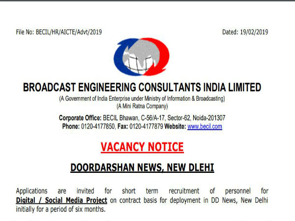 ಬ್ರಾಡ್ಕಾಸ್ಟ್ ಇಂಜಿನಿಯರಿಂಗ್ ಕನ್ಸಲ್ಟೆಂಟ್ಸ್ ಇಂಡಿಯಾ ಲಿಮಿಟೆಡ್ ನೇಮಕಾತಿ 8 ಕ್ರಿಯೇಟಿವ್ ಬರಹಗಾರರು ಮತ್ತು ಸೋಶಿಯಲ್ ಮೀಡಿಯಾ ಮೆವೆನ್ಸ್ ಹುದ್ದೆಗಳನ್ನು ಭರ್ತಿ ಮಾಡುವುದಾಗಿ ಅಧಿಕೃತ ವೆಬ್ಸೈಟ್ ನಲ್ಲಿ ಪ್ರಕಟಣೆ ಹೊರಡಿಸಲಾಗಿದೆ. ಆಸಕ್ತ ಅರ್ಹ ಅಭ್ಯರ್ಥಿಗಳು ಫೆಬ್ರವರಿ 25,2019 ರೊಳಗೆ ಅರ್ಜಿಯನ್ನು ಸಲ್ಲಿಸಬಹುದು.