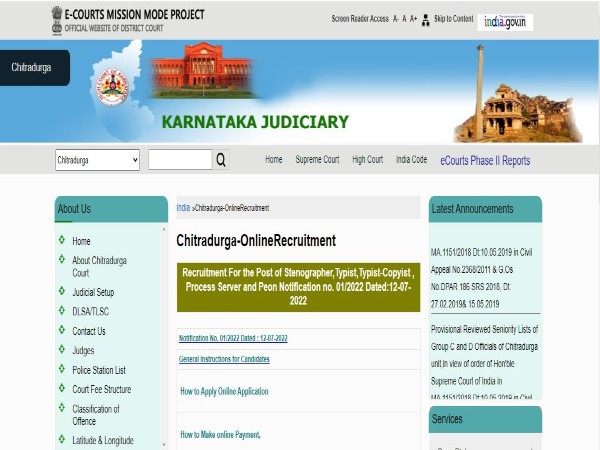 ಆಸಕ್ತ ಮತ್ತು ಅರ್ಹ ಅಭ್ಯರ್ಥಿಗಳು ಆನ್ಲೈನ್ನಲ್ಲಿ ಚಿತ್ರದುರ್ಗ ಜಿಲ್ಲಾ ನ್ಯಾಯಾಲಯದ ಅಧಿಕೃತ ವೆಬ್ಸೈಟ್ https://districts.ecourts.gov.in/chitradurga-onlinerecruitment ಗೆ ಭೇಟಿ ನೀಡಿ. ಅಲ್ಲಿ ಕೇಳಲಾಗಿರುವ ಮಾಹಿತಿಯನ್ನು ಭರ್ತಿ ಮಾಡುವ ಮೂಲಕ ಜುಲೈ 15,2022 ರಿಂದ ಆಗಸ್ಟ್ 18,2022ರ ರಾತ್ರಿ 11:59ರೊಳಗೆ ಮಾತ್ರ ಅರ್ಜಿಯನ್ನು ಸಲ್ಲಿಸಬೇಕಿರುತ್ತದೆ. ಆನ್ಲೈನ್ ಹೊರತುಪಡಿಸಿ ಇತರೆ ಯಾವುದೇ ವಿಧಾನದಲ್ಲಿ ಕಳುಹಿಸಿದ ಅರ್ಜಿಯನ್ನು ಪರಿಗಣಿಸಲಾಗುವುದಿಲ್ಲ.