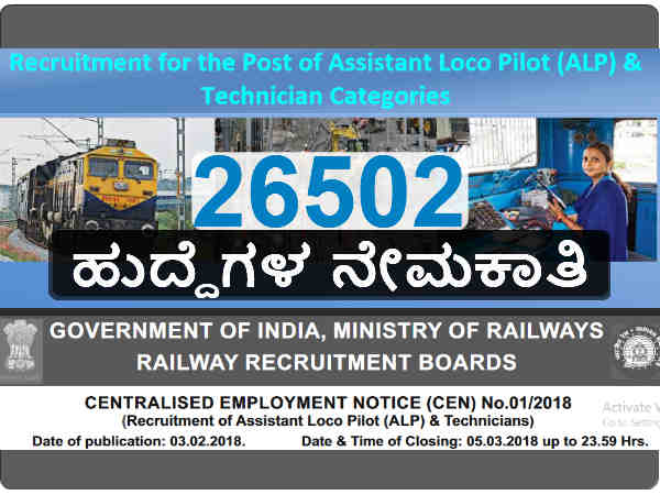 ಅಸಿಸ್ಟೆಂಟ್ ಲೋಕೋ ಪೈಲಟ್ ಮತ್ತು ಟೆಕ್ನಿಷಿಯನ್ ಹುದ್ದೆಗಳ ನೇಮಕಾತಿಗೆ ಅರ್ಜಿ ಆಹ್ವಾನಿಸಿದ್ದು, ಅರ್ಹ ಅಭ್ಯರ್ಥಿಗಳು ಆನ್-ಲೈನ್ ಮೂಲಕ ಅರ್ಜಿಗಳನ್ನು ಸಲ್ಲಿಸಬಹುದಾಗಿದೆ.