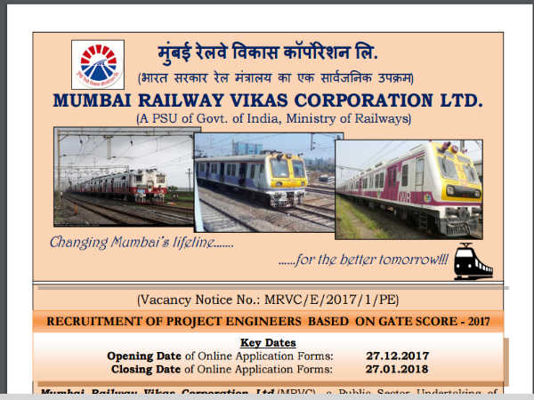 ಮುಂಬೈ ರೈಲ್ವೆ ವಿಕಾಸ್ ಕಾರ್ಪೊರೇಷನ್ ನಿಯಮಿತದಲ್ಲಿ ಇಂಜಿನಿಯರ್ ಹುದ್ದೆಗಳು ಖಾಲಿ ಇದ್ದು, ಅರ್ಹ ಮತ್ತು ಆಸಕ್ತ ಅಭ್ಯರ್ಥಿಗಳು ಅರ್ಜಿಗಳನ್ನು ಸಲ್ಲಿಸಬಹುದಾಗಿದೆ.