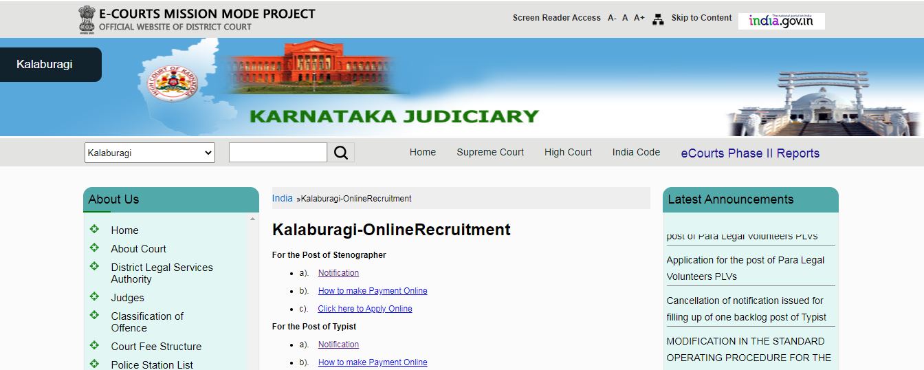 ಕಲಬುರಗಿ ಜಿಲ್ಲಾ ನ್ಯಾಯಾಲಯದಲ್ಲಿ ಖಾಲಿ ಇರುವ 56 ಶೀಘ್ರಲಿಪಿಗಾರ, ಬೆರಳಚ್ಚುಗಾರ, ಬೆರಳಚ್ಚು ನಕಲುಗಾರ, ಆದೇಶ ಜಾರಿಕಾರ ಮತ್ತು ಜವಾನ ಹುದ್ದೆಗಳನ್ನು ಭರ್ತಿ ಮಾಡಲು ಅರ್ಜಿಗಳನ್ನು ಆಹ್ವಾನಿಸಿದೆ. ಆಸಕ್ತರು ಅಧಿಕೃತ ವೆಬ್ಸೈಟ್ಗೆ ಭೇಟಿ ನೀಡಿ ಹುದ್ದೆಗಳ ಬಗೆಗಿನ ಅಧಿಸೂಚನೆಯನ್ನು ಓದಬಹುದು.