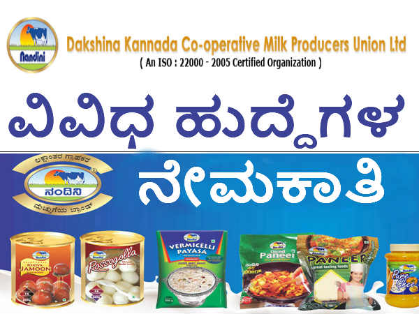 ದಕ್ಷಿಣ ಕನ್ನಡ ಸಹಕಾರ ಹಾಲು ಉತ್ಪಾದಕರ ಸಂಘಗಳ ಒಕ್ಕೂಟ ದಲ್ಲಿ ಖಾಲಿ ಇರುವ ವಿವಿಧ ವೃಂದಗಳಲ್ಲಿನ ಹುದ್ದೆಗಳನ್ನು ಭರ್ತಿ ಮಾಡಲು ಅರ್ಜಿ ಅಹ್ವಾನಿಸಲಾಗಿದೆ.