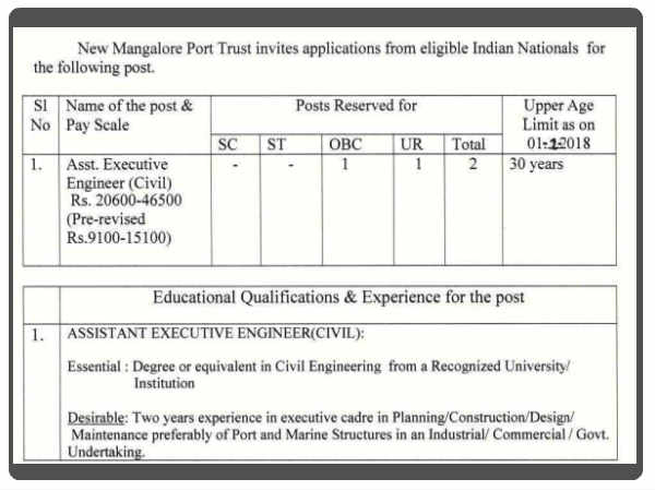 ನ್ಯೂ ಮಂಗಳೂರು ಪೋರ್ಟ್ ಟ್ರಸ್ಟ್ ನಲ್ಲಿ ಅವಶ್ಯವಿರುವ ಎಇಇ (ಸಿವಿಲ್ ) ಇಂಜಿನಿಯರ್ ಹುದ್ದೆಗಳನ್ನು ಭರ್ತಿ ಮಾಡಲು ಅರ್ಹ ಅಭ್ಯರ್ಥಿಗಳಿಂದ ಅರ್ಜಿಗಳನ್ನು ಆಹ್ವಾನಿಸಲಾಗಿದೆ.