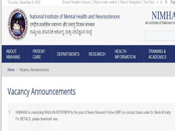 ನಿಮಾನ್ಸ್ ನೇಮಕಾತಿ ಹುದ್ದೆಯ ಕಂಪ್ಲೀಟ್ ಡೀಟೆಲ್ಸ್: