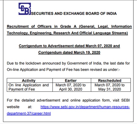ಸೆಕ್ಯುರಿಟಿ ಮತ್ತು ಎಕ್ಸ್ಚೇಂಜ್ ಬೋರ್ಡ್ ಆಫ್ ಇಂಡಿಯಾ (ಸೆಬಿ) 147 ಸಹಾಯಕ ವ್ಯವಸ್ಥಾಪಕ ( ಗ್ರೇಡ್ ಎ ) ಹುದ್ದೆಗಳನ್ನು ಭರ್ತಿ ಮಾಡಲು ಅರ್ಜಿ ಆಹ್ವಾನಿಸಲಾಗಿದ್ದು ಅರ್ಜಿ ಸಲ್ಲಿಕೆಯ ಅವಧಿಯನ್ನು ವಿಸ್ತರಿಸಲಾಗಿದೆ. ಆಸಕ್ತರು ಅಧಿಕೃತ ವೆಬ್ಸೈಟ್ಗೆ ಭೇಟಿ ನೀಡಿ ಹುದ್ದೆಗಳ ಬಗೆಗಿನ ಅಧಿಸೂಚನೆಯನ್ನು ಓದಬಹುದು.