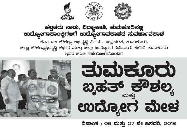 ತುಮಕೂರು ಜಿಲ್ಲಾ ಕೌಶಲ್ಯಾಭಿವೃದ್ಧಿ ಕಛೇರಿ ಮತ್ತು ಜಿಲ್ಲಾ ಉದ್ಯೋಗ ವಿನಿಮಯ ಕಛೇರಿ ತುಮಕೂರು ಇವರ ಜಂಟಿ ಸಹಯೋಗದಲ್ಲಿ 'ತುಮಕೂರು ಬೃಹತ್ ಕೌಶಲ್ಯ ಮತ್ತು ಉದ್ಯೋಗ ಮೇಳ' ಆಯೋಜಿಸಲಾಗುತ್ತಿದೆ.