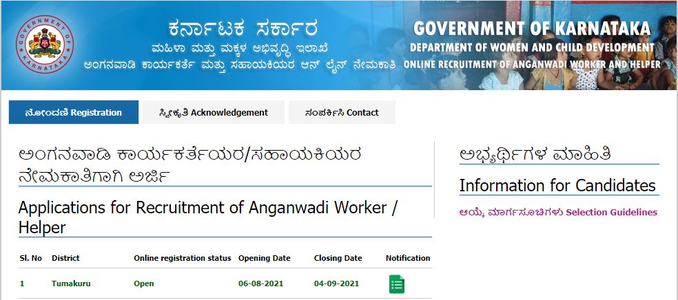 ತುಮಕೂರು ಜಿಲ್ಲೆಯ ಮಹಿಳಾ ಮತ್ತು ಮಕ್ಕಳ ಅಭಿವೃದ್ಧಿ ಇಲಾಖೆಯಡಿ ಕಾರ್ಯನಿರ್ವಹಿಸುತ್ತಿರುವ 11 ಶಿಶು ಅಭಿವೃದ್ಧಿ ಯೋಜನೆಗಳ ವ್ಯಾಪ್ತಿಯಲ್ಲಿ ಕಂಡುಬರುವ ಅಂಗನವಾಡಿ ಕೇಂದ್ರಗಳಲ್ಲಿ ಖಾಲಿ ಇರುವ 73 ಅಂಗನವಾಡಿ ಕಾರ್ಯಕರ್ತೆ ಮತ್ತು 285 ಸಹಾಯಕಿಯರ ಹುದ್ದೆಗಳು ಸೇರಿದಂತೆ 358 ಹುದ್ದೆಗಳನ್ನು ನೇಮಕ ಮಾಡಲು ಅರ್ಹ ಮಹಿಳಾ ಅಭ್ಯರ್ಥಿಗಳಿಂದ ಆನ್ಲೈನ್ ಮೂಲಕ ಅರ್ಜಿಗಳನ್ನು ಆಹ್ವಾನಿಸಲಾಗಿದೆ.