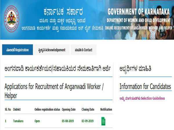 ತುಮಕೂರು ಜಿಲ್ಲೆಯಲ್ಲಿ ಖಾಲಿ ಇರುವ ಒಟ್ಟು 116 ಅಂಗನವಾಡಿ ಕಾರ್ಯಕರ್ತೆ ಮತ್ತು ಅಂಗನವಾಡಿ ಸಹಾಯಕಿಯರ ಗೌರವ ಸೇವೆಯ ಹುದ್ದೆಗಳನ್ನು ನೇಮಕ ಮಾಡಲು ಅರ್ಹ ಮಹಿಳಾ ಅಭ್ಯರ್ಥಿಗಳಿಂದ ಆನ್ಲೈನ್ ಮೂಲಕ ಅರ್ಜಿಗಳನ್ನು ಆಹ್ವಾನಿಸಲಾಗಿದೆ.