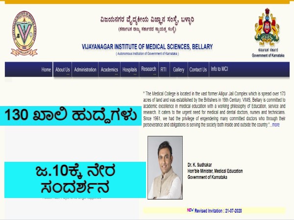 ವಿಜಯನಗರ ವೈದ್ಯಕೀಯ ವಿಜ್ಞಾನ ಸಂಸ್ಥೆ, ಬಳ್ಳಾರಿ ನೇಮಕಾತಿಯ ಶುಶ್ರೂಷಾಧಿಕಾರಿ, ರೇಡಿಯೋಗ್ರಾಫರ್, ಫಾರ್ಮಾಸಿ ಅಧಿಕಾರಿ, ಕ್ಷ-ಕಿರಣ ತಂತ್ರಜ್ಞರು, ಫಿಜಿಯೋಥೆರಪಿಸ್ಟ್, ಡಯೆಟಿಷಿಯನ್, ಲ್ಯಾಬ್ ಟೆಕ್ನಿಷಿಯನ್, ಡ್ರೈವರ್, ಡಯಾಲಿಸಿಸ್ ಟೆಕ್ನಿಷಿಯನ್ ಮತ್ತು ಸಿಟಿ ಟೆಕ್ನಿಷಿಯನ್ ಹುದ್ದೆಗಳಿಗೆ ನೇರ ಸಂದರ್ಶನ ನಡೆಸಲಾಗುತ್ತಿದ್ದು, ಯಾವುದೇ ಅರ್ಜಿ ಶುಲ್ಕವನ್ನು ಪಾವತಿಸುವಂತಿಲ್ಲ.