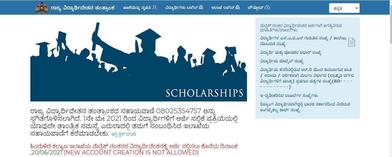 2020-21ನೇ ಸಾಲಿಗೆ ಹಿಂದುಳಿದ ವರ್ಗಗಳ ಕಲ್ಯಾಣ ಇಲಾಖೆಯ ಮೂಲಕ ನೀಡಲಾಗುತ್ತಿರುವ "ಮೆಟ್ರಿಕ್-ನಂತರದ ವಿದ್ಯಾರ್ಥಿವೇತನ", "ಶುಲ್ಕ ವಿನಾಯಿತಿ", "ವಿದ್ಯಾಸಿರಿ-ಊಟ ಮತ್ತು ವಸತಿ ಸಹಾಯ ಯೋಜನೆ" ಮತ್ತು "ನರ್ಸಿಂಗ್ ವಿದ್ಯಾರ್ಥಿಗಳಿಗೆ ಶಿಷ್ಯವೇತನ" ಸೌಲಭ್ಯಕ್ಕಾಗಿ ಅರ್ಜಿ ಸಲ್ಲಿಕೆಯ ಅವಧಿಯನ್ನು ವಿಸ್ತರಿಸಲಾಗಿದೆ.