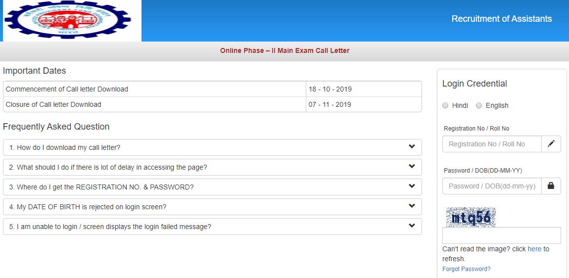 ಇಪಿಎಫ್ಓ ನೇಮಕಾತಿಯ ಅಸಿಸ್ಟೆಂಟ್ ಹುದ್ದೆಗಳ ಆನ್ಲೈನ್ ಫೇಸ್ -II ಪ್ರಮುಖ ಪರೀಕ್ಷಾ ಪ್ರವೇಶ ಪತ್ರವನ್ನು ಡೌನ್ ಲೋಡ್ ಮಾಡಲು ಕೆಳಗಿನ ಸ್ಟೆಪ್ಸ್ ಫಾಲೋ ಮಾಡಿ: