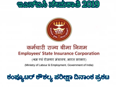 ಇಎಸ್ಐಸಿ ಭಾರತದೆಲ್ಲೆಡೆ ಒಟ್ಟು 1934 ಹುದ್ದೆಗಳನ್ನು ಭರ್ತಿ ಮಾಡಲು ಏಪ್ರಿಲ್ 15.2019ರೊಳಗೆ ಅರ್ಜಿಯನ್ನು ಆಹ್ವಾನಿಸಲಾಗಿತ್ತು. ಕರ್ನಾಟಕದಲ್ಲಿ ಒಟ್ಟು 159 ಹುದ್ದೆಗಳು ಖಾಲಿ ಇದ್ದು, ಈ ಹುದ್ದೆಗಳಿಗೆ ಅರ್ಜಿ ಸಲ್ಲಿಸಿದ ಅಭ್ಯರ್ಥಿಗಳಿಗೆ ಕಂಪ್ಯೂಟರ್ ಕೌಶಲ್ಯ ಪರೀಕ್ಷೆ ನಡೆಸುತ್ತಿದೆ.