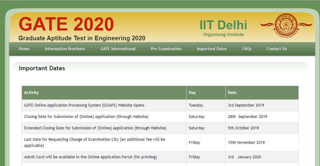 ಇಂಡಿಯನ್ ಇನ್ಸ್ಟಿಟ್ಯೂಟ್ ಆಫ್ ಟೆಕ್ನಾಲಜಿ,ದೆಹಲಿ ನಡೆಸುವ 2020ರ ಗೇಟ್ ಪರೀಕ್ಷೆಯ ಪ್ರಮುಖ ದಿನಾಂಕಗಳ ಪಟ್ಟಿಯನ್ನು ಬಿಡುಗಡೆ ಮಾಡಲಾಗಿದೆ ಹಾಗೂ ಆನ್ಲೈನ್ ಅರ್ಜಿ ಸಲ್ಲಿಕೆಯ ಅವಧಿ ವಿಸ್ತರಿಸಲಾಗಿದೆ. ಗ್ರಾಜ್ಯುಯೇಶನ್ ಅಪ್ಟಿಟ್ಯುಡ್ ಟೆಸ್ಟ್ ಇನ್ ಇಂಜಿನೀಯರಿಂಗ್ ಇದೊಂದು ರಾಷ್ಟ್ರೀಯ ಮಟ್ಟದ ಪರೀಕ್ಷೆಯಾಗಿದೆ.