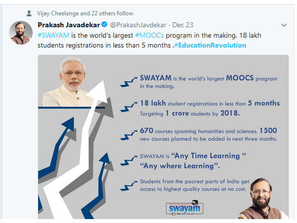 ಮುಕ್ತ ಮತ್ತು ಆನ್ಲೈನ್ ಕೋರ್ಸ್ ಗೆ ಸಂಬಂಧಿಸಿದಂತೆ ಆರಂಭವಾದ ಕೇಂದ್ರ ಸರ್ಕಾರದ ಮಹತ್ವದ 'ಸ್ವಯಂ' ಯೋಜನೆ ಗೆ ದೇಶಾದ್ಯಂತ ಉತ್ತಮ ಪ್ರತಿಕ್ರಿಯೆ ವ್ಯಕ್ತಯಾಗಿದ್ದು, ಮುಂಬರುವ ದಿನಗಳಲ್ಲಿ ಮತ್ತಷ್ಟು ವಿಸ್ತರಿಸುವ ಗುರಿ ಹೊಂದಿದೆ.