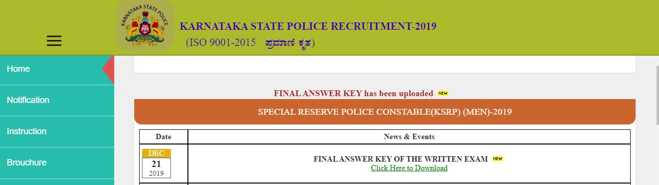 ಇಲಾಖೆಯು ನವೆಂಬರ್ 24,2019 ರಂದು 218 ವಿಶೇಷ ಮೀಸಲು ಪೊಲೀಸ್ ಕಾನ್ಸ್ಟೇಬಲ್ ಹುದ್ದೆಗಳ ನೇಮಕಾತಿಗಾಗಿ, ರಾಜ್ಯದ ಹಲವು ಕೇಂದ್ರಗಳಲ್ಲಿ ಲಿಖಿತ ಪರೀಕ್ಷೆಯನ್ನು ನಡೆಸಲಾಗಿತ್ತು. ಇದೀಗ ಅಂತಿಮ ಕೀ ಉತ್ತರಗಳನ್ನು ಕರ್ನಾಟಕ ಪೊಲೀಸ್ ಇಲಾಖೆಯ ಅಧಿಕೃತ ವೆಬ್ಸೈಟ್ ನಲ್ಲಿ ಬಿಡುಗಡೆ ಮಾಡಲಾಗಿದೆ. ಅಭ್ಯರ್ಥಿಗಳು ತಾವು ಪರೀಕ್ಷೆ ಬರೆದ ಪ್ರಶ್ನೆ ಪತ್ರಿಕೆ ಸೀರೀಸ್ ಪ್ರಕಾರ ಉತ್ತರಗಳನ್ನು ಚೆಕ್ ಮಾಡಿಕೊಳ್ಳಬಹುದು.