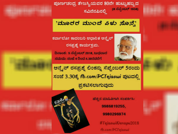 ಸೆಪ್ಟೆಂಬರ್ 8, 2018 ಕ್ಕೆ ಅವರ 80ನೇ ಹುಟ್ಟು ಹಬ್ಬವನ್ನು ವಿಶೇಷವಾಗಿ ಆಚರಿಸುವ ಮತ್ತು ಈ ಸಂದರ್ಭದಲ್ಲಿ ತೇಜಸ್ವಿಯವರನ್ನು ನೆನಪು ಮಾಡಿಕೊಳ್ಳುವ ಸಲುವಾಗಿ ಆನ್ಲೈನ್ ರಸಪ್ರಶ್ನೆ ಕಾರ್ಯಕ್ರಮ ಏರ್ಪಡಿಸಲಾಗಿದೆ. ನೀವು ಇರುವಲ್ಲಿಯೆ ಕುಳಿತು ಮೊಬೈಲ್, ಲ್ಯಾಪ್ ಟ್ಯಾಪ್, ಕಂಪ್ಯೂಟರ್ ಬಳಸಿ ಕ್ವಿಜ್ ತೆಗೆದುಕೊಳ್ಳಬಹುದು.