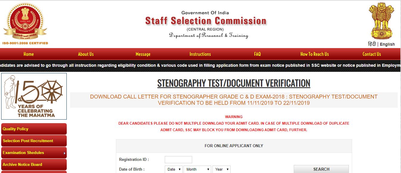 ಶೀಘ್ರಲಿಪಿಗಾರ ಪರೀಕ್ಷೆ ಅಥವಾ ದಾಖಲೆಗಳ ಪರಿಶೀಲನೆಯು ನವೆಂಬರ್ 11,2019 ರಿಂದ ನವೆಂಬರ್ 22,2019ರ ವರೆಗೆ ನಡೆಯಲಿದ್ದು, ಅಭ್ಯರ್ಥಿಗಳು ಅಧಿಕೃತ ವೆಬ್ಸೈಟ್ http://ssc-cr.org/index.php ಗೆ ಭೇಟಿ ನೀಡಿ ಪ್ರವೇಶ ಪತ್ರವನ್ನು ಡೌನ್ಲೋಡ್ ಮಾಡಿಕೊಳ್ಳಬಹುದು.