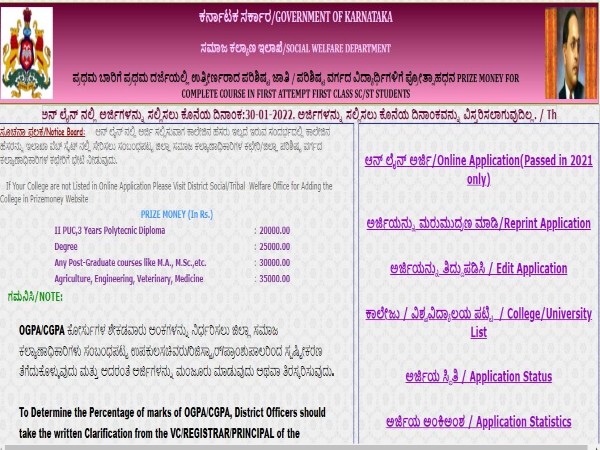 ಅರ್ಜಿಗಳನ್ನು ಸಲ್ಲಿಸಲು ಕೊನೆಯ ದಿನಾಂಕವನ್ನು ವಿಸ್ತರಿಸಲಾಗುವುದಿಲ್ಲ. ಆನ್ಲೈನ್ ಅರ್ಜಿಗಳನ್ನು ಮಾತ್ರ ಸಲ್ಲಿಸಬೇಕು. ಆನ್ಲೈನ್ ಅರ್ಜಿ ಸಲ್ಲಿಸುವಾಗ ಕಾಲೇಜಿನ ಹೆಸರು ಇಲ್ಲದೆ ಇರುವ ಸಂದರ್ಭದಲ್ಲಿ ಕಾಲೇಜಿನ ಹೆಸರನ್ನು ಇಲಾಖಾ ವೆಬ್ಸೈಟ್ನಲ್ಲಿ ಸೇರಿಸಲು ಸಂಬಂಧಪಟ್ಟ ಜಿಲ್ಲಾ ಸಮಾಜ ಕಲ್ಯಾಣಾಧಿಕಾರಿಗಳ ಕಚೇರಿ / ಜಿಲ್ಲಾ ಪರಿಶಿಷ್ಟ ವರ್ಗದ ಕಲ್ಯಾಣಾಧಿಕಾರಿಗಳ ಕಚೇರಿಗೆ ಭೇಟಿ ನೀಡಲು ಸೂಚಿಸಲಾಗಿದೆ.