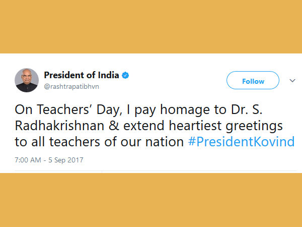 ದೇಶದ ಎಲ್ಲ ಶಿಕ್ಷಕ ವೃಂದಕ್ಕೂ ಶುಭ ಹಾರೈಕೆ ಶಿಕ್ಷಕರ ದಿನದಂದು ಸರ್ವಪಳ್ಳಿ ರಾಧಾಕೃಷ್ಣನ್ ಅವರಿಗೆ ನನ್ನ ನಮನಗಳು. ಹಾಗೆಯೇ ನಮ್ಮ ರಾಷ್ಟದ ಎಲ್ಲ ಶಿಕ್ಷಕ ವೃಂದಕ್ಕೂ ನನ್ನ ಶುಭಹಾರೈಕೆಗಳು ಎಂದು ರಾಷ್ಟ್ರಪತಿ ರಾಮನಾಥ್ ಕೋವಿಂದ್ ಅವರು ಟ್ವೀಟ್ ಮಾಡಿದ್ದಾರೆ