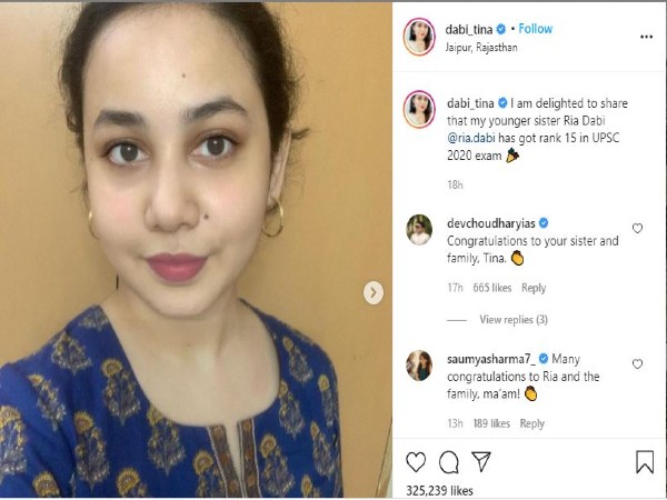 2016 ರಲ್ಲಿ ಟೀನಾ ಡಾಬಿ ಅಖಿಲ ಭಾರತ ನಂಬರ್ ಒನ್ ಸ್ಥಾನ ಪಡೆದು ಖ್ಯಾತಿ ಪಡೆದಿದ್ದರು. ಇದೀಗ ಅವರ ಸಹೋದರಿಯ ಈ ಸಾಧನೆಗೆ ಸಂತಸ ವ್ಯಕ್ತಪಡಿಸಿರುವ ಟೀನಾ ಡಾಬಿ ಸಾಮಾಜಿಕ ಜಾಲತಾಣದಲ್ಲಿ "ನನ್ನ ತಂಗಿ ರಿಯಾ ಡಾಬಿ ಯುಪಿಎಸ್ಸಿ 2020ರ ಪರೀಕ್ಷೆಯಲ್ಲಿ 15 ನೇ ರ್ಯಾಂಕ್ ಪಡೆದಿದ್ದನ್ನು ಹಂಚಿಕೊಳ್ಳಲು ನನಗೆ ಸಂತೋಷವಾಗಿದೆ" ಎಂದು ಟ್ವೀಟ್ ಮಾಡಿದ್ದಾರೆ.