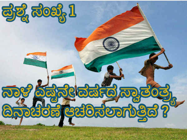 ಆಗಸ್ಟ್ 15 ರಂದು ದೇಶದೆಲ್ಲೆಡೆ ಸ್ವಾತಂತ್ರ್ಯ ದಿನಾಚರಣೆ ಸಂಭ್ರಮ. ಈ ಹಿನ್ನೆಲೆ ನಮ್ಮ ಯುವಜನತೆಗೆ ದೇಶದ ಬಗ್ಗೆ ಎಷ್ಟು ತಿಳಿದಿದೆ ಎಂದು ಚೆಕ್ ಮಾಡಲು ಈ ಸಣ್ಣ ಕ್ವಿಜ್. ಇದೀಗ ಪ್ರಶ್ನೆ ಸಂಖ್ಯೆ 1. ಅದೇನೆಂದ್ರೆ ಈ ಬಾರಿ ಎಷ್ಟನೇ ವರ್ಷದ ಸ್ವಾತಂತ್ರ್ಯ ದಿನಾಚರಣೆ ಆಚರಿಸಲಾಗುತ್ತಿದೆ?